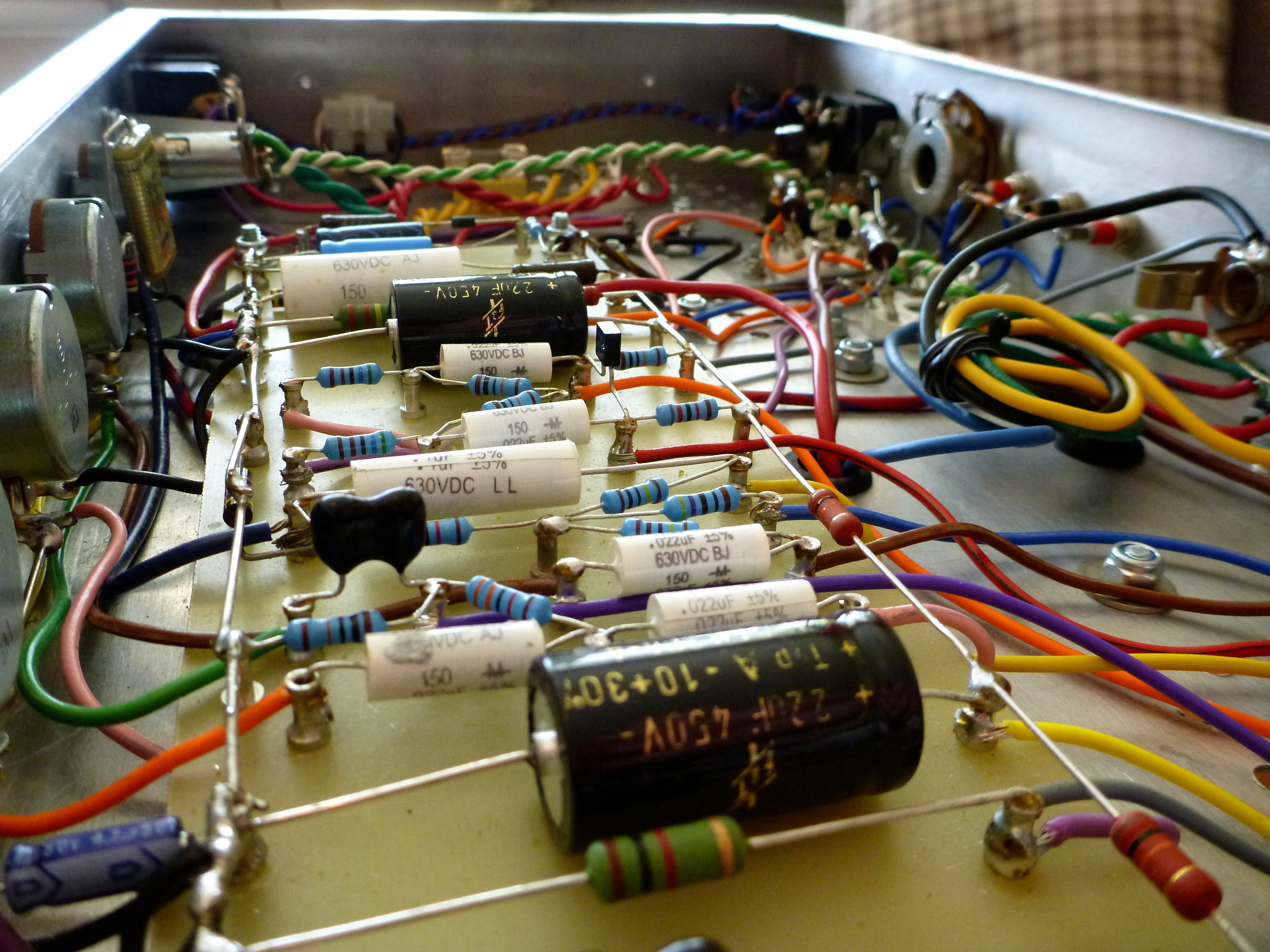 By far, this is my biggest, most complex and ambitious amp build to date. I used the same basic Hammond chassis and turret board parts as my previous projects, recalling as much as possible of the skills I aquired ten years ago when I made the Tremolux, while trying to improve several things on top of that. It amounted to tons of trial-and-error, parts swapping and resoldering, but the effort paid off – this is easily the most clean circuit I've made.