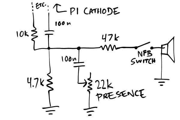 I was disappointed at first with the presence control, which did almost nothing, so I modified it a bit and increased the negative feedback (the “depth” of the presence) by lowering the nfb resistor from 100 k to 33 k. This made the presence knob and the negative feedback switch more effective. I prefer the sound without nfb but enable it sometimes to tame the power.