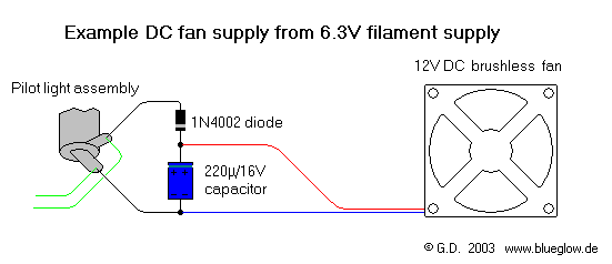 Perhaps the most excessive feature is the cooling fan in the back. Opinions on the benefits of such a thing varies widely on the web, but I had a 12 V computer fan laying around, and I found that you can rectify the 6.3 V heater current and supply the fan with that (provided that the PT has enough current to spare). It will run slower than what it was designed for, but it works fine. The rectified 6.3 VAC power turned out to be 8.9 VDC – ideal for standard 9 V DC jacks, so I installed two of those (see chassis pic above) and plugged the fan into one of them.
